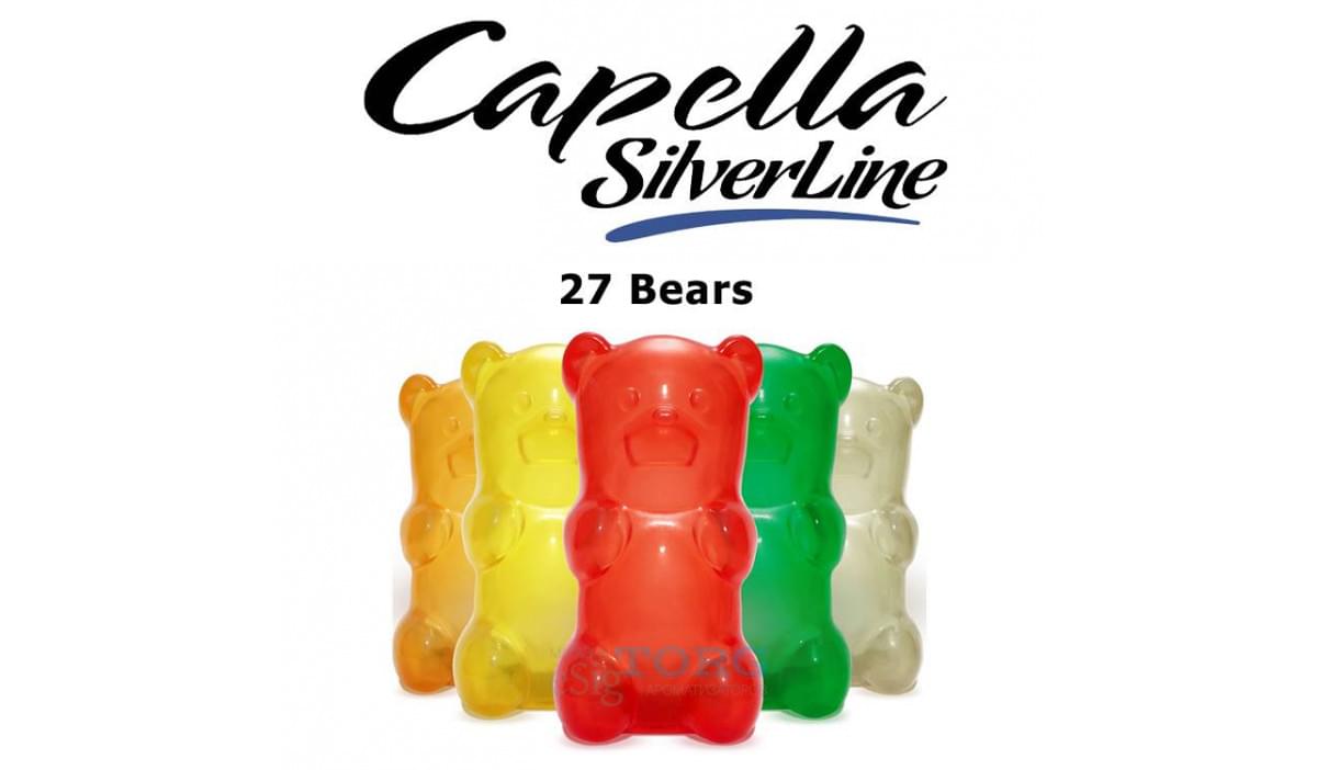 27 Bears — аромат жевательных конфет. Во вкусе: жевательный мармелад, цитрусовые и другие фрукты (отчетливо — ананас), а также ягоды на фоне (клубника, малина). Очень полная, объемная и сладкая смесь. Умеренный и быстрый тротхит. Рекомендуется смешиваяать арому 27 Bears Capella SilverLine в пропорциях 5-6% (соло) и 0,5-5% (в смесях).